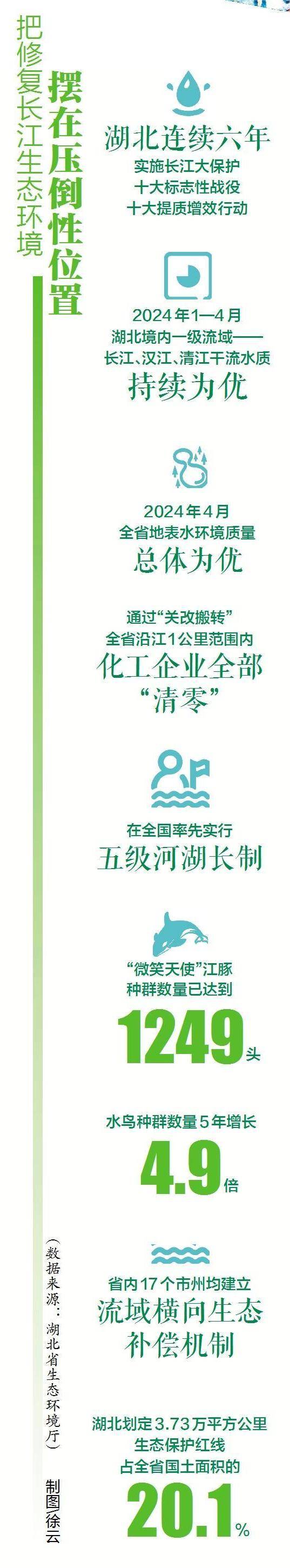在不断加强的生态保护与修复中,湖北水鸟种群数量5年增长4.9倍,鳤鱼、刀鱼等稀有鱼种重现长江。一度濒临灭绝的江豚,达到令人欣喜的1249头,“长江的微笑”回来了。