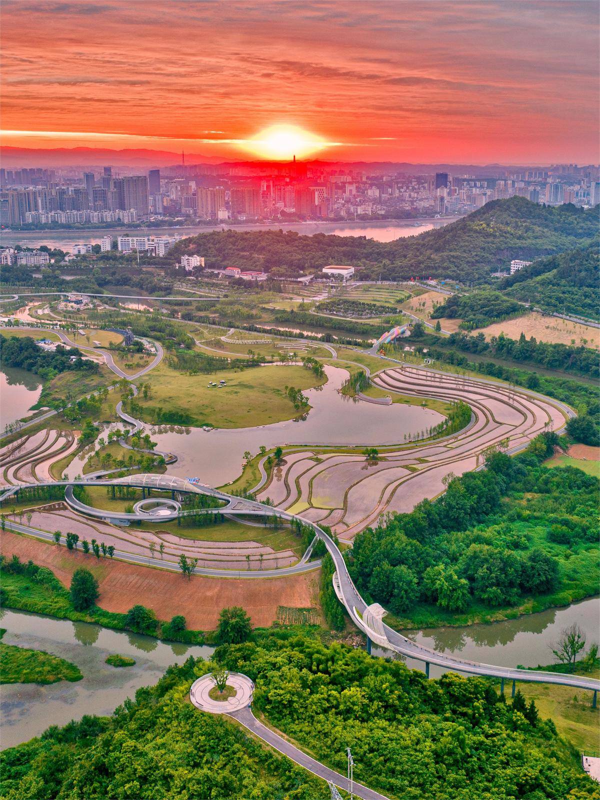 6月3日清晨,朝霞映满宜昌市卷桥河湿地公园。(湖北日报全媒记者 刘曙松 摄)
