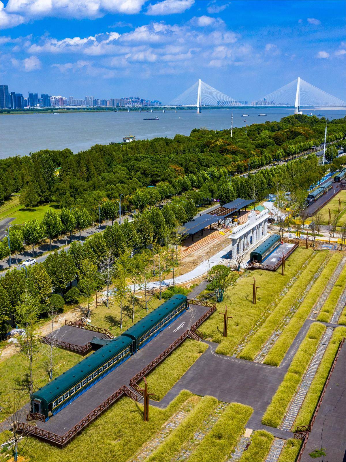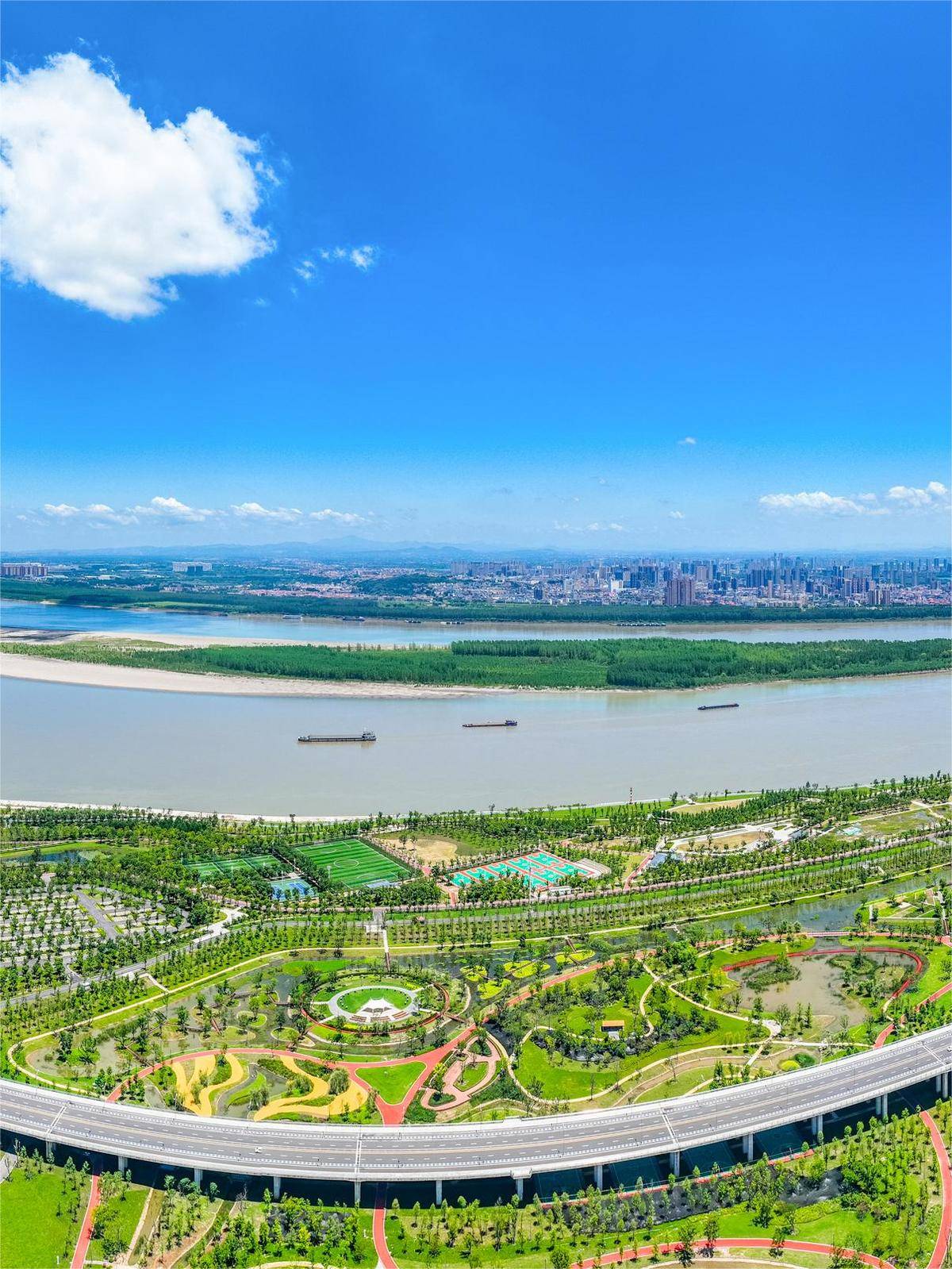 图为俯瞰湖北省首个采用海绵城市理念打造的江滩公园——青山江滩,曾荣膺中国建设工程鲁班奖。青山江滩的变化是湖北省长江岸线综合整治的一个缩影。(湖北日报全媒记者魏铼 摄)