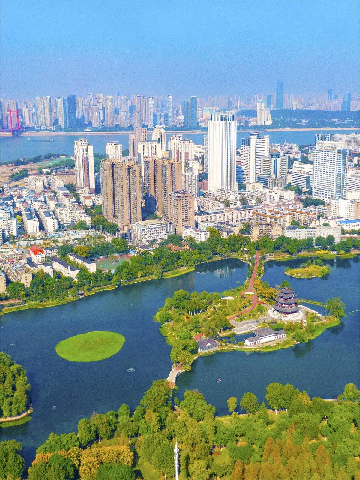 图为俯瞰武汉市武昌区紫阳公园犹如一块碧玺镶嵌在城市中间。坐落在武昌区中心地带的紫阳公园是一座人与自然、城与自然和谐共生的现代化公园。(湖北日报全媒记者魏铼 摄)