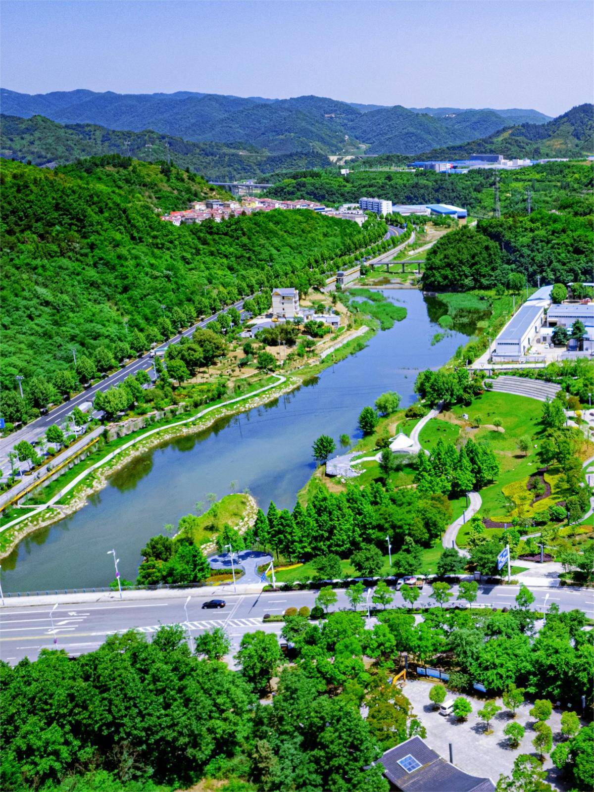5月14日,俯瞰十堰市茅箭区茅塔河枧槽沟段生态湿地,青山含黛,草木葱茏,水清岸绿,旖旎多姿。(视界网 全正 摄)