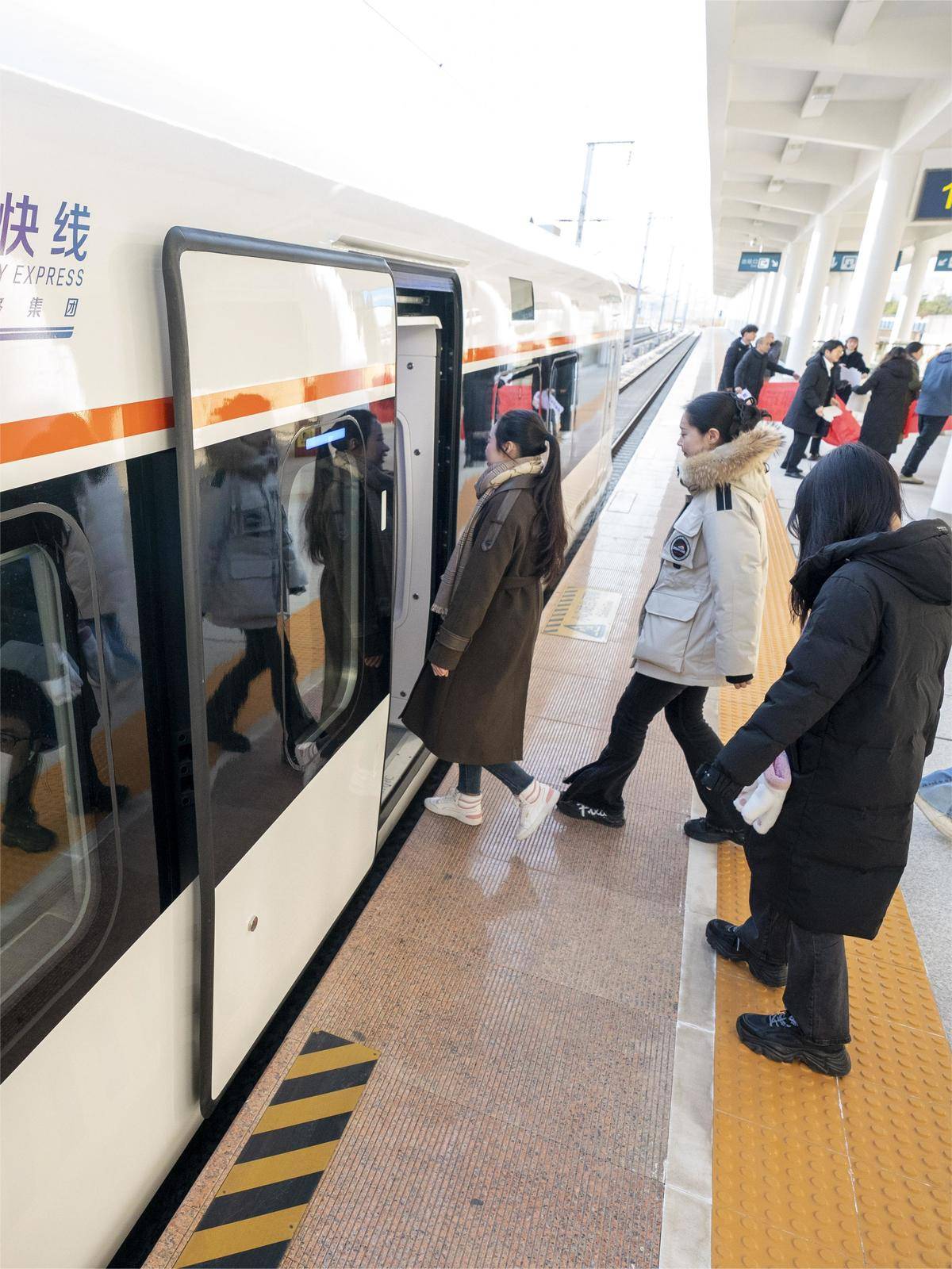 武汉东站站台,一列崭新的“新城快线”列车准备驶出站台。2024年,武鄂黄黄都市圈城际铁路公交化运营“新城快线”列车正式开行。(湖北日报全媒记者 魏铼 摄)