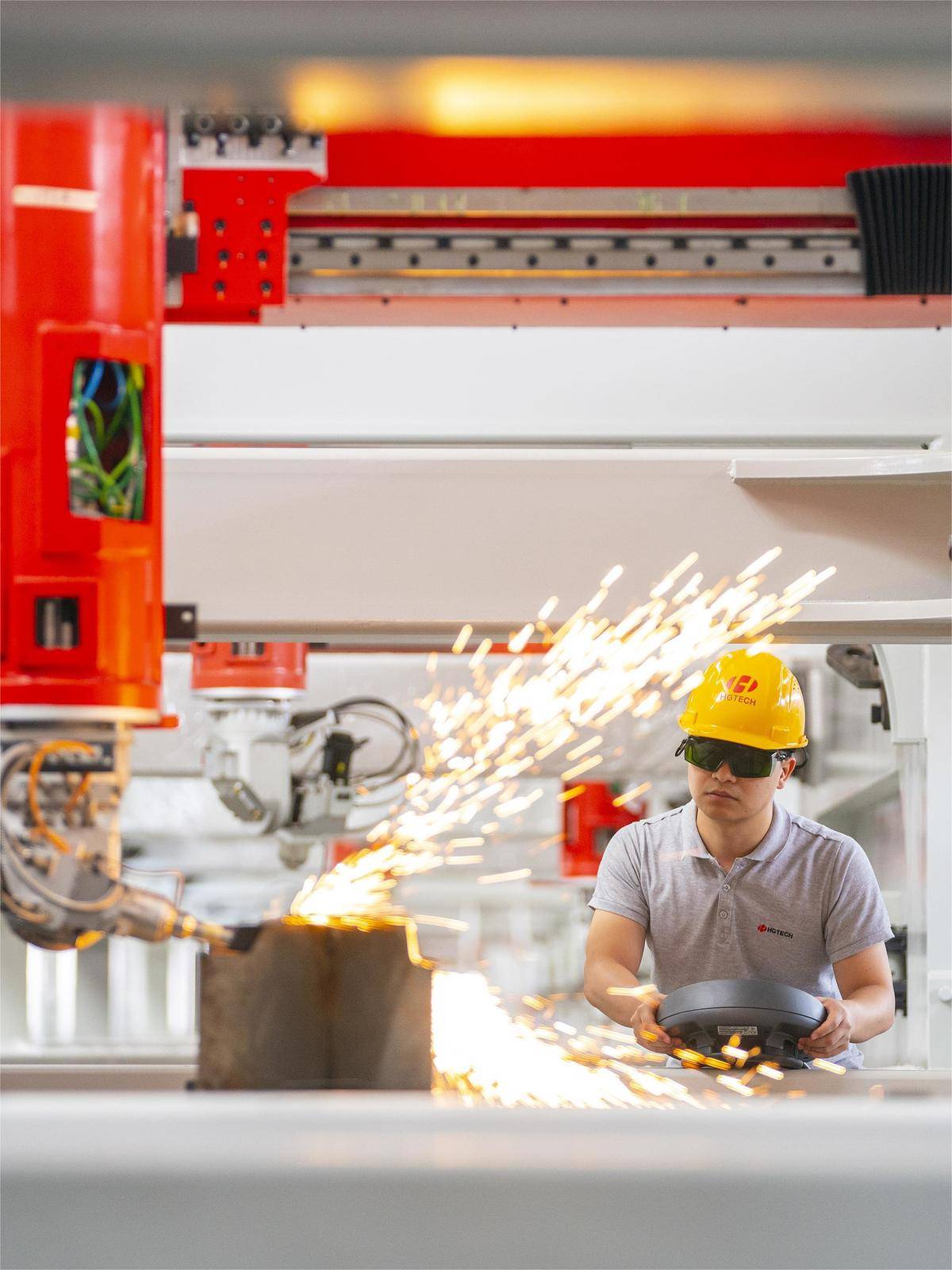 图为位于武汉新城的华工科技智能装备产业园(葛店园区),在国内最大的三维五轴激光切割机产线上,工作人员正加紧组装、调试订单设备。目前,以华工科技为代表的许多光谷企业在武鄂黄黄都市圈建设生产基地,形成了“研发在光谷,生产在都市圈”新发展格局。(湖北日报全媒记者 魏铼 摄)