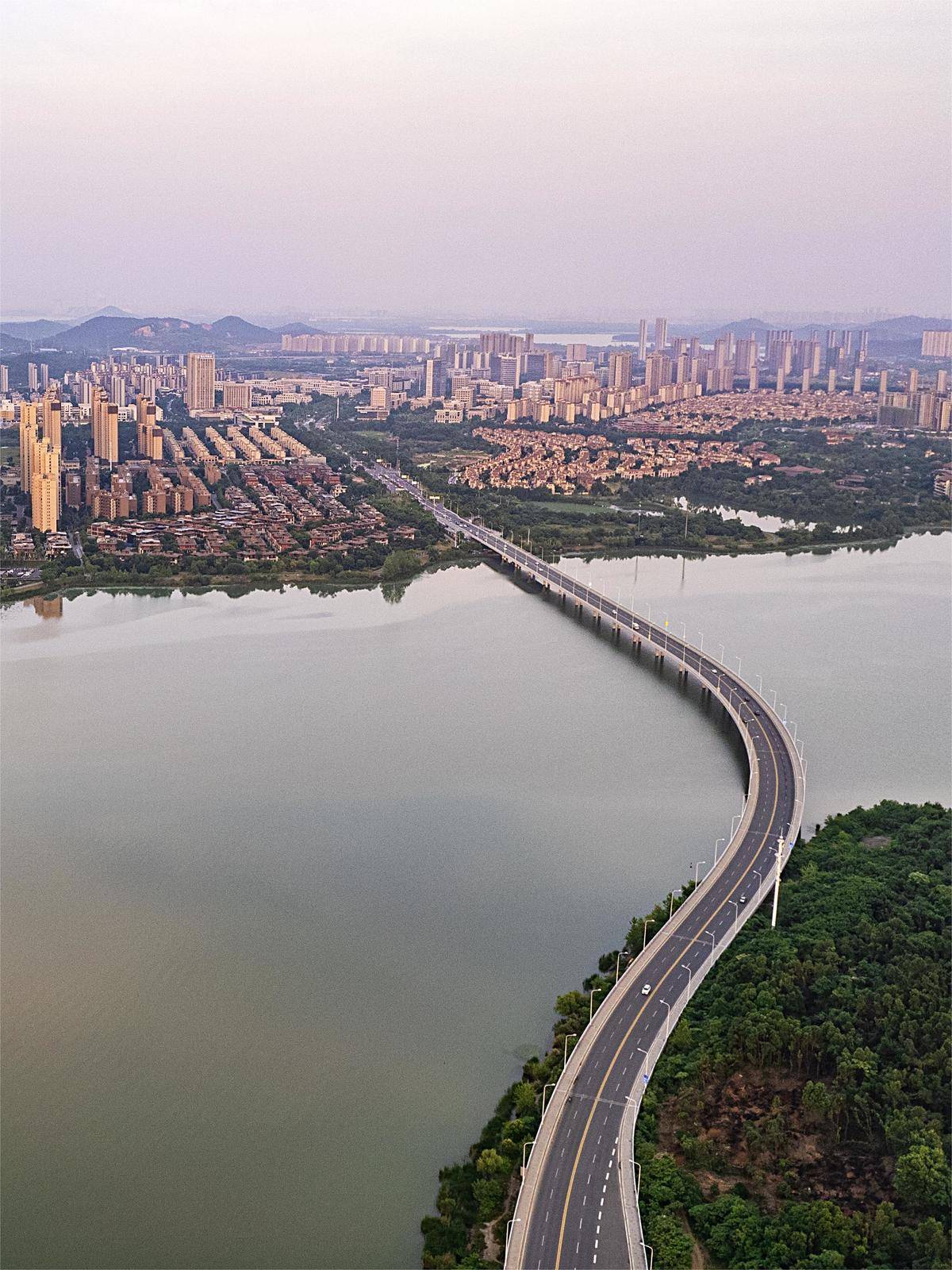 图为航拍高新大道短咀里湖桥两岸的武汉新城光谷片区和鄂州片区。(湖北日报全媒记者 魏铼 摄)