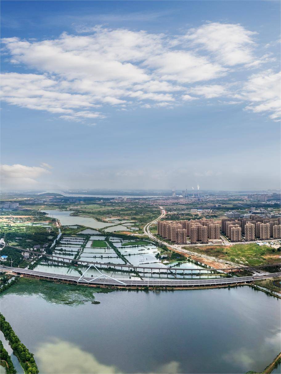 5月16日,鸟瞰花山生态新城。这里原是武汉东湖高新区东北“一江三湖”(长江、北湖、严西湖、严东湖)交汇处的城郊小镇,近年蝶变为充满活力的产业新城、绿色样板城。 (湖北日报全媒记者 朱熙勇 摄)