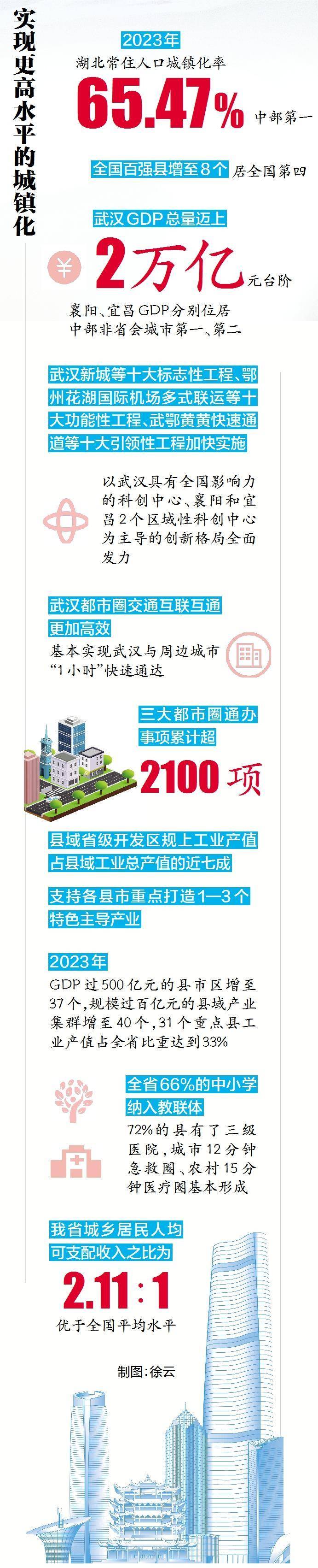 2023年,湖北常住人口城镇化率增长至65.47%,居中部第一;全国百强县增至8个,居全国第四。