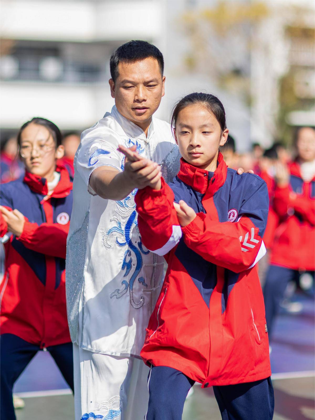 11月27日,黄梅县第一小学,非遗传承人雷超(左)指导学生操练岳家拳。(湖北日报全媒记者 薛婷 通讯员 石勋 摄)
