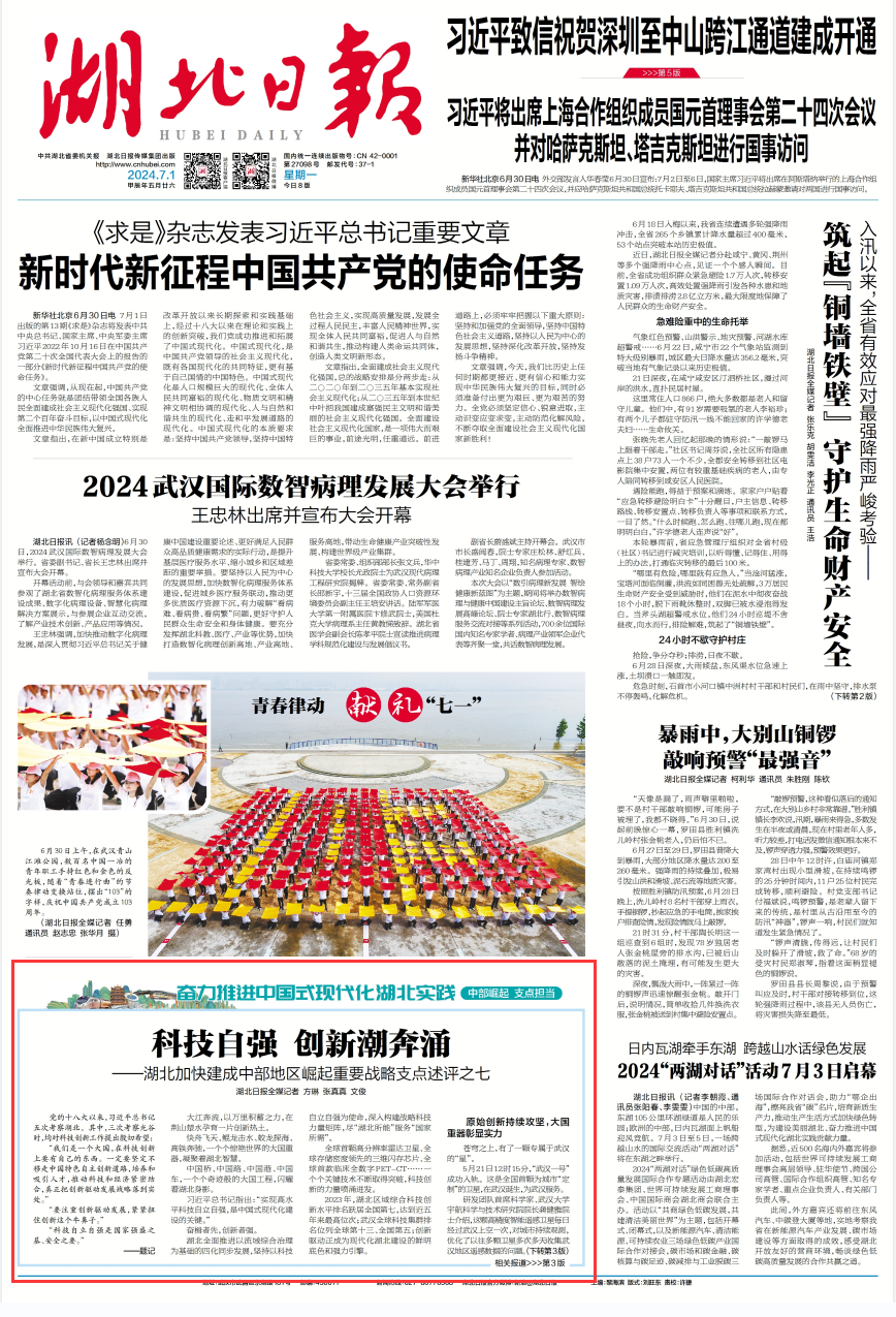 湖北全面推进以流域综合治理为基础的四化同步发展,坚持以科技自立自强为使命,深入构建战略科技力量矩阵,尽“湖北所能”服务“国家所需”。