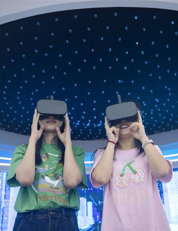 湖北移动“智慧武汉5G创新港”内,市民借助VR眼镜体验5G通信技术应用成果。(湖北日报全媒记者 薛婷 摄)