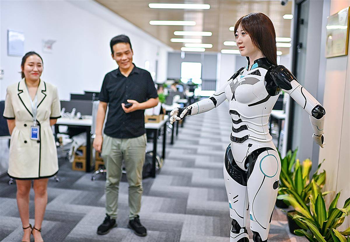 6月9日,北京清博智能科技有限公司武汉分公司的仿人形机器人迎宾“小丽”。(湖北日报全媒记者 朱熙勇 摄)