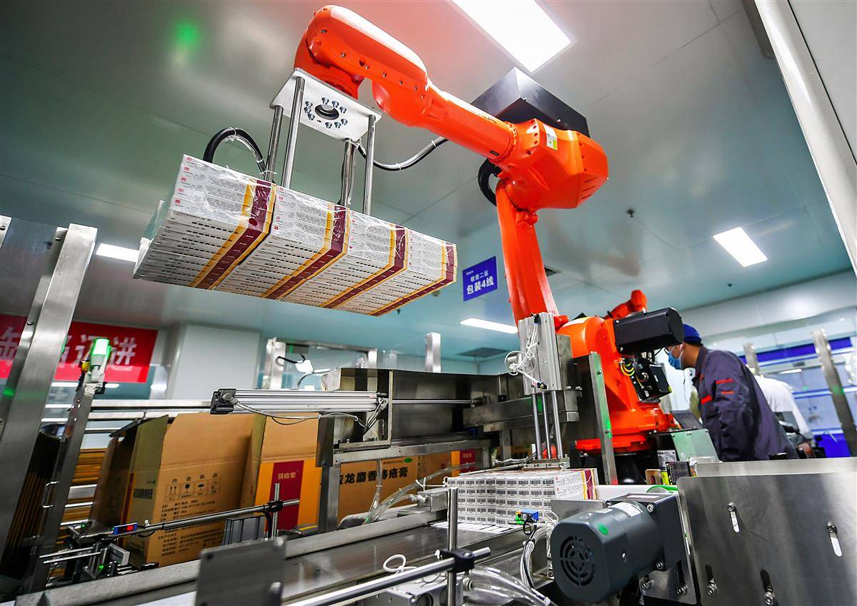 马应龙药业集团股份有限公司的软膏生产车间内,多功能仿生机械手包揽了灌装、封装等一系列生产工序。(湖北日报全媒记者 朱熙勇 摄)