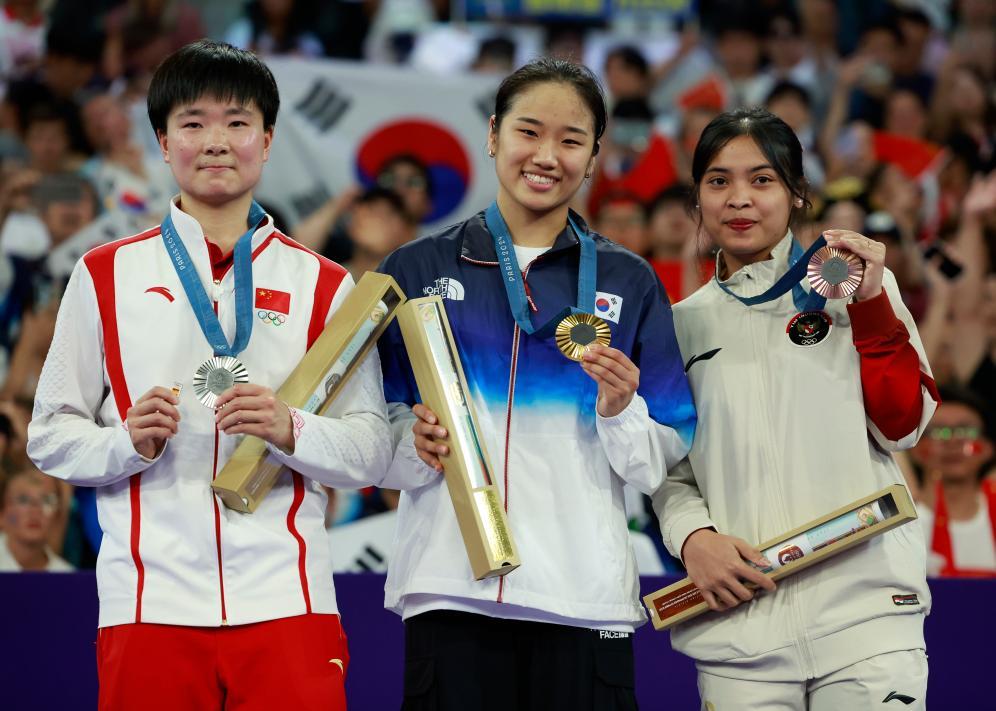△8月5日,羽毛球女单冠军韩国选手安洗莹(中)、亚军中国选手何冰娇(左)、季军印度尼西亚选手玛丽斯卡在颁奖仪式上。