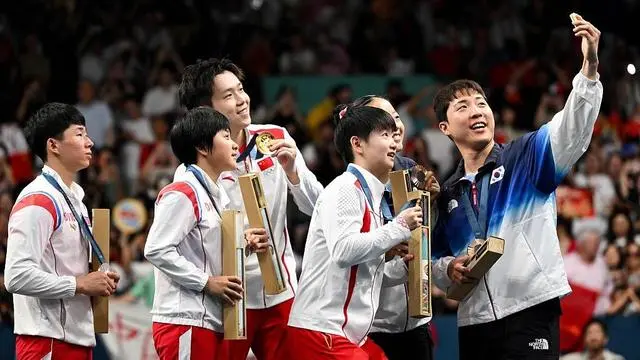 △巴黎奥运会乒乓球混合双打颁奖仪式结束后,中朝韩运动员聚到一起合影的场景,在朋友圈刷了屏。