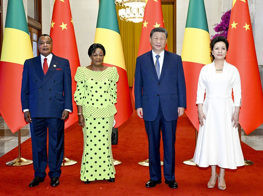 9月6日上午,国家主席习近平在北京人民大会堂同来华出席中非合作论坛北京峰会并进行国事访问的刚果(布)总统萨苏举行会谈。会谈前,习近平和夫人彭丽媛在人民大会堂北大厅为萨苏和夫人安托瓦内特举行欢迎仪式。这是习近平和彭丽媛同萨苏和安托瓦内特合影。