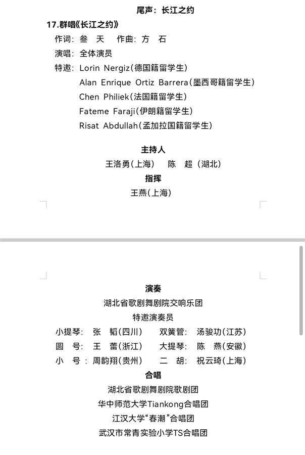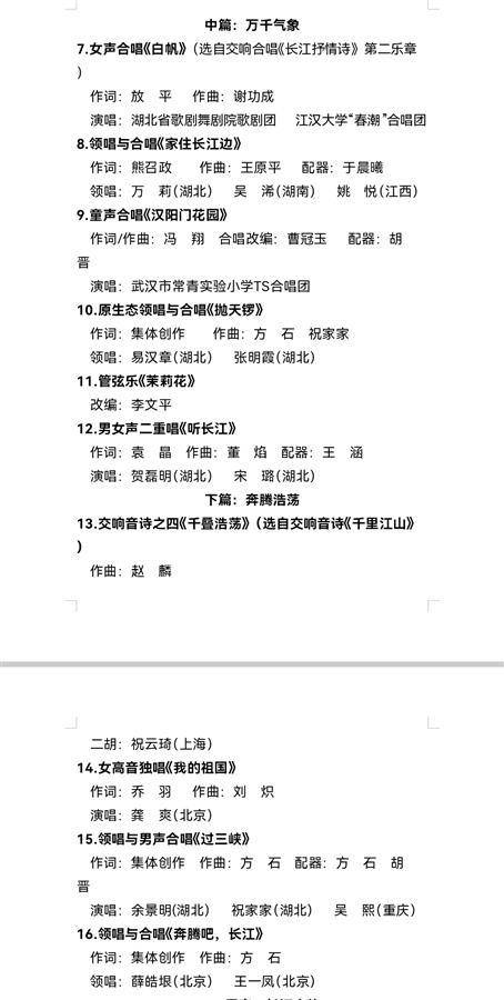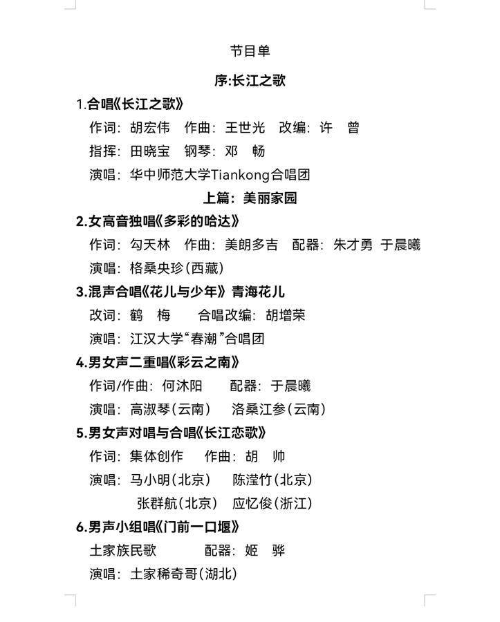 “相约长江”合唱周启动式音乐会分为“序•长江之歌”“上篇•美丽家园”“中篇•万千气象”“下篇•奔腾浩荡”以及“尾声•长江之约”五个篇章,共包含17个精彩节目,展现长江沿线的多彩风光和丰富文化,表达中华儿女对壮丽长江和伟大祖国的深情礼赞,为观众们带来一场具有民族风情、地域特色和中国气派的音乐盛宴。