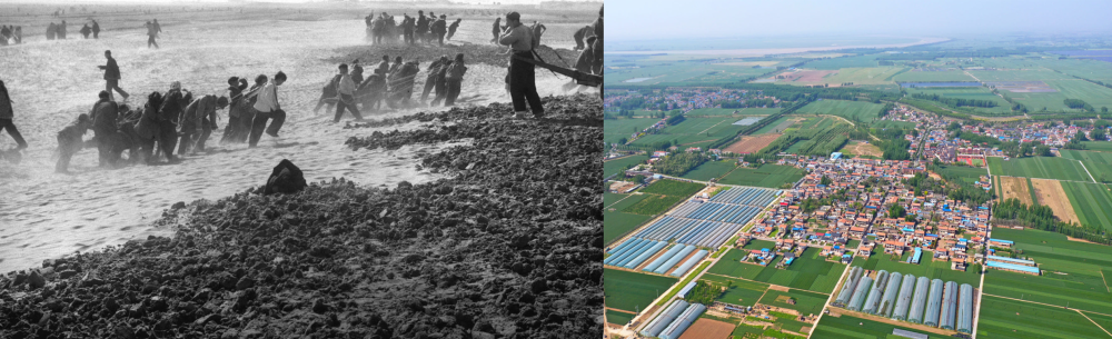 拼版照片:左图为兰考群众在拉淤土压沙(新华社记者 邓历耕 摄);右图为2024年4月25日拍摄的兰考县张庄村(无人机照片,新华社记者 郝源 摄)。