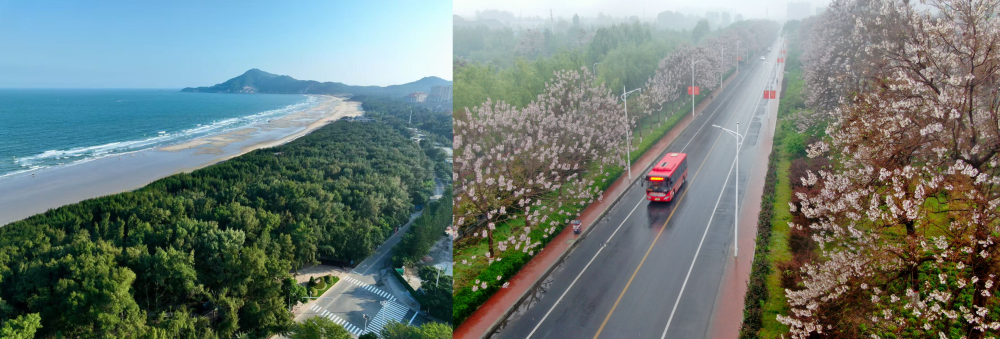 拼版照片:左图为位于东山县金銮湾沿岸的木麻黄防护林带(无人机照片,新华社记者 姜克红 摄);右图为2021年4月20日在兰考县焦裕禄干部学院附近拍摄的泡桐花(无人机照片,新华社记者 郝源 摄)。