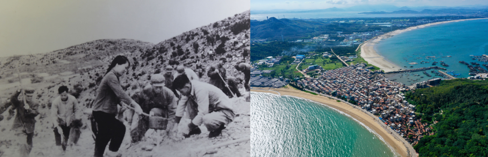 拼版照片:左图为东山县群众在荒山上种植树苗(资料照片);右图为2020年6月18日拍摄的东山县陈城镇澳角村附近风光(无人机照片,新华社记者 姜克红 摄)。