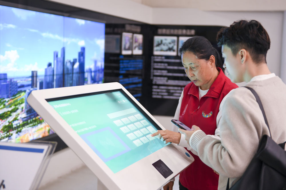 2024年11月27日,志愿者帮助香港居民在深圳前海e站通服务中心办理业务。服务中心安装的“跨境通办”自助服务机,让香港市民无需返港就能便捷办理香港政务服务事项。