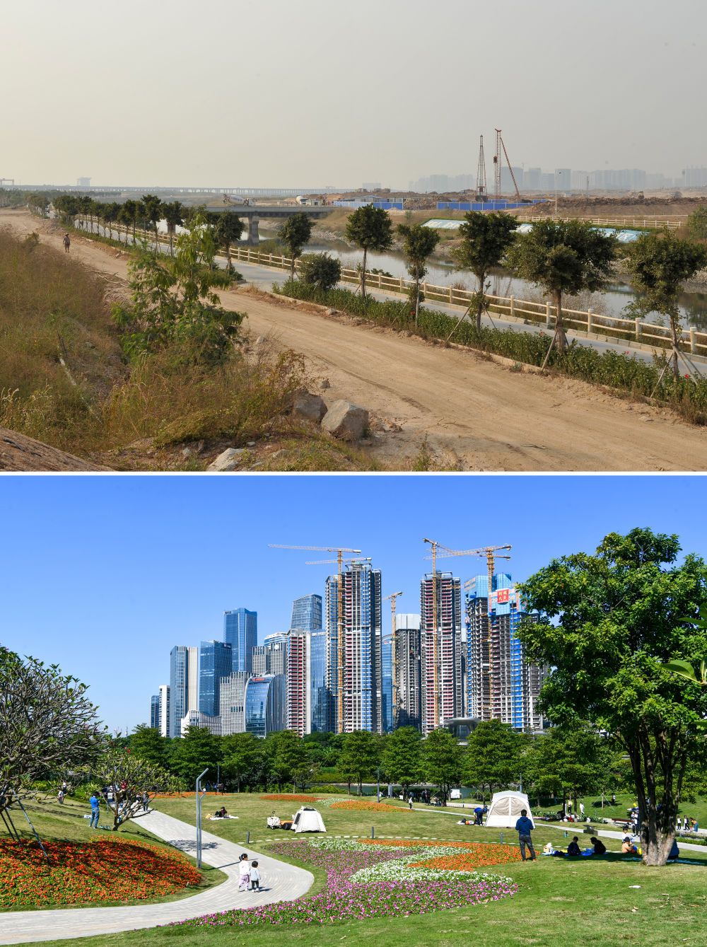这是一张拼版照片:上图为2012年10月22日拍摄的深圳前海;下图为2024年11月30日拍摄的深圳前海。
