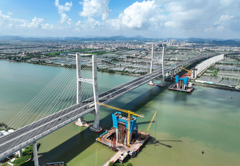 2024年9月1日,深江铁路跨磨刀门水道主桥东主墩(左下)下横梁浇筑完成(无人机照片)。深江铁路建成通车后,深圳、东莞、广州、中山、江门这五座大湾区城市将更紧密地连接在一起,实现深圳前海自贸区与广州南沙自贸区半小时高铁互联互通。