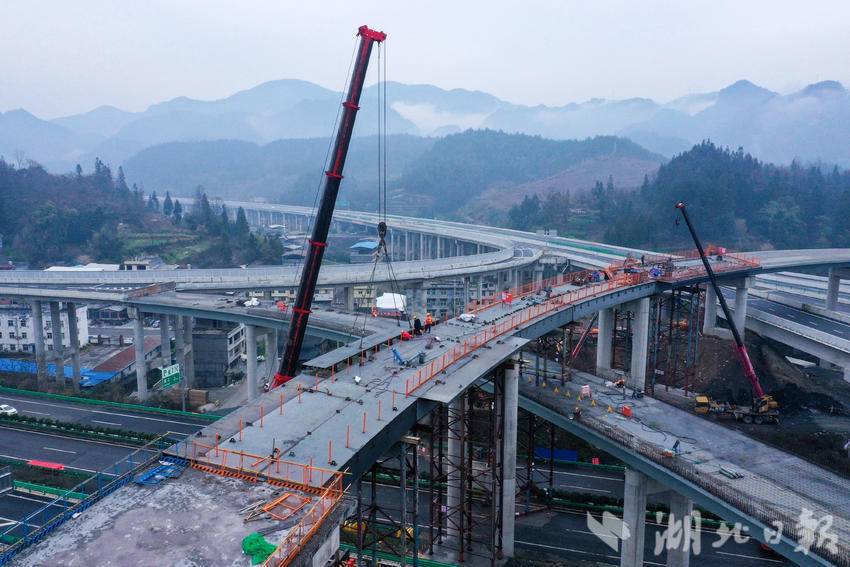 小模枢纽互通位于咸丰县小模村,是利咸高速项目的终点,承担着与恩黔、张南高速的交通转换功能。由于地处交通要道,周边路网复杂,涉及上跨两条高速,且施工跨度大,整体施工难度较高。此次完成架设的G匝道桥第四联钢箱梁全长107米,高1.8米,分24个节段吊装,单块最重达53.7吨,总重量达509.5吨,是项目的重难点工程。