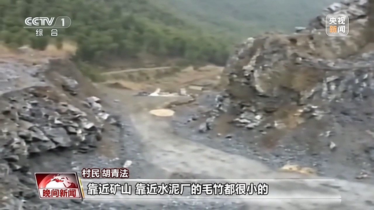 村民 胡青法:那片山都是灰蒙蒙的。那时候很明显,靠近矿山、靠近水泥厂的毛竹,都很小的。