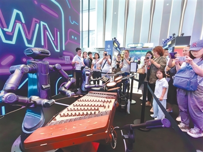 服务人形机器人为观众演奏扬琴。本报记者 潘俊强摄