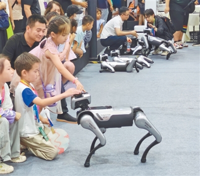 互动小朋友与具有陪伴功能的魔法原子机器狗互动。本报记者 潘俊强摄