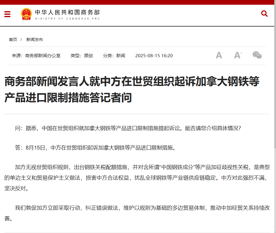 答:8月15日,中方在世贸组织起诉加拿大钢铁等产品进口限制措施。
