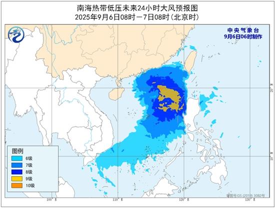大风预报:9月6日08时至7日08时,南海大部、巴士海峡、台湾海峡南部、珠江口区、广东中东部沿海将有6—8级大风,其中南海东部部分海域风力可达9—10级,阵风11—12级。