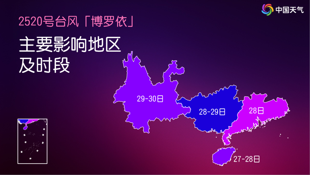 29日,“博罗依”趋近越南,海南降雨减弱,广西西部和南部、云南东南部仍有大到暴雨,局地大暴雨;30日,“博罗依”对我国影响开始收尾,云南南部和东部仍有大雨,局地暴雨。