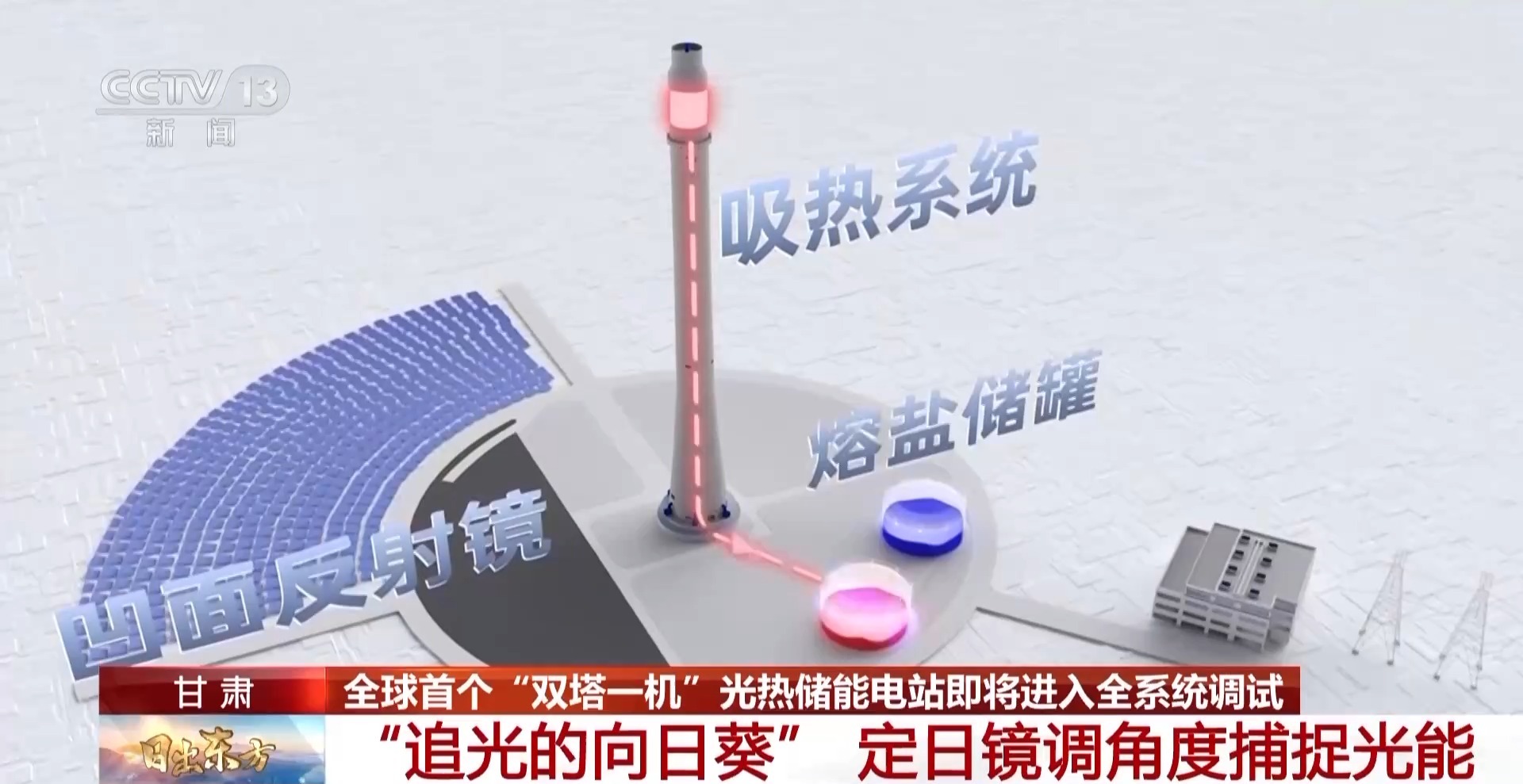全球首个“双塔一机”光热储能电站在甘肃酒泉瓜州。千百年来,西北地区风、日之暴烈,是边塞诗歌中的重要元素。如今两座集热塔矗立于大漠戈壁之上,两万多定日镜如涟漪般围绕,将茫茫戈壁变成了绿潮涌动的能源新高地。