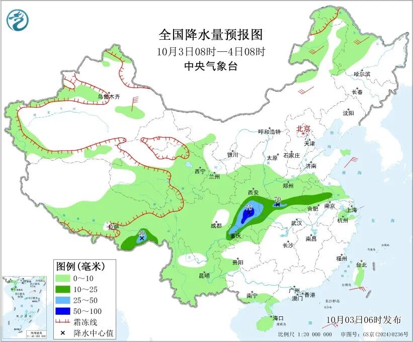 未来三天,甘肃东部、宁夏南部、陕西、四川东部、重庆西部和北部、湖北西部和北部、河南、河北南部、山东、山西、安徽中部等地将有中到大雨,局地有暴雨或大暴雨。