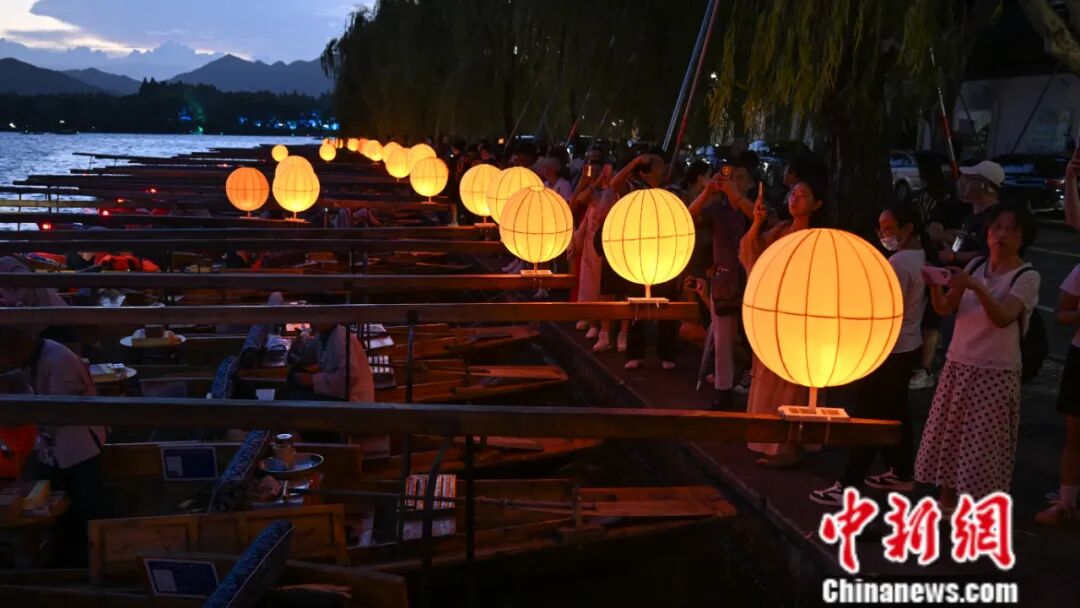 2024年9月17日,众多月亮船在西湖边集结吸引游客。当日是中国传统中秋佳节,浙江杭州西湖景区举行中秋拜月活动。 中新社记者 王刚 摄