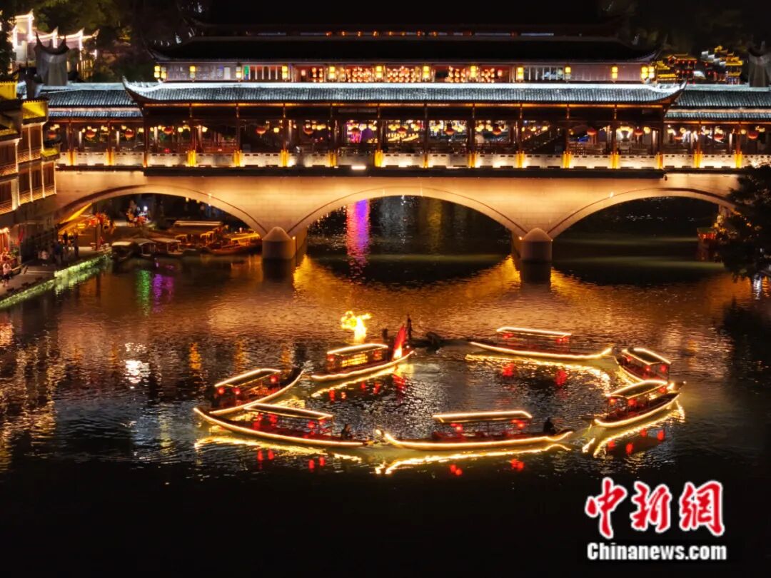 2025年10月5日,湖南凤凰古城沱江上,百米灯光金龙游船拼接出圆月图案。图为金龙游船首尾相接,吸引游客沉浸式感受古城中秋氛围。中新社记者 杨华峰 摄