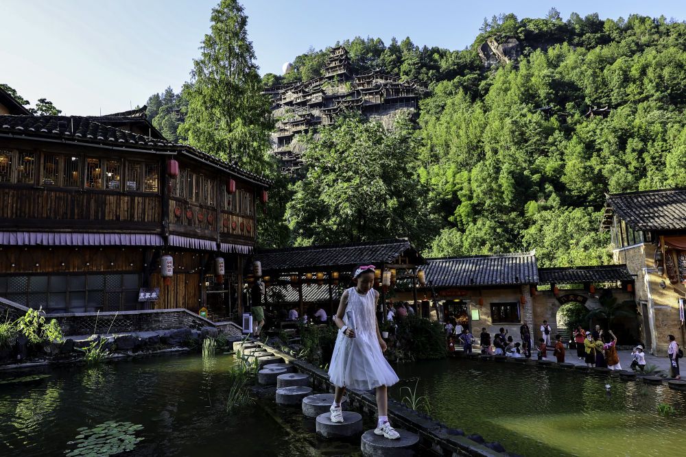 2025年7月11日,游客在位于江西省上饶市望仙乡的望仙谷景区游览。近年来,望仙谷景区因其独特的“仙侠世界”景观火爆出圈,吸引大批游客来此观光。景区2024年接待游客310万人次,全年实现旅游收入5.28亿元,同时显著带动周边乡镇的食、住、行、娱等行业发展。望仙谷景区的建设运营促进了村民返乡和能人进乡,提供直接就业岗位超过2000个,带动周边就业3万余人。
