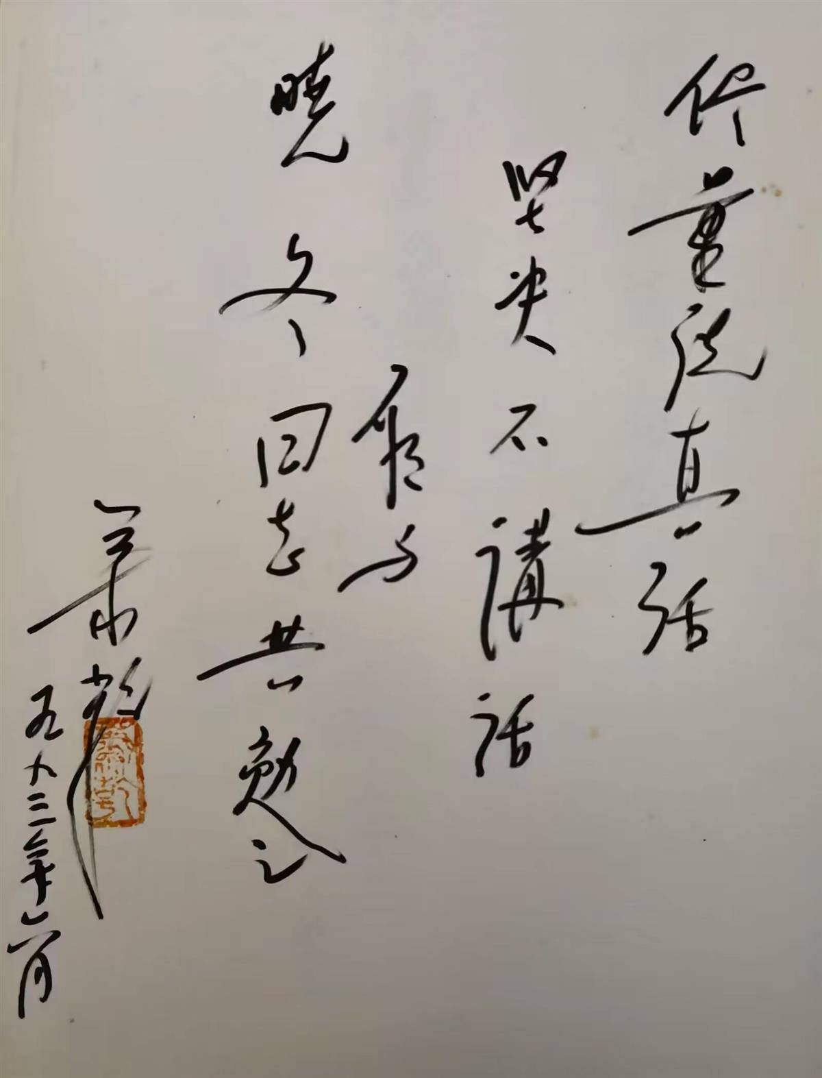 1946年萧乾回国,随后参加了香港《大公报》起义。1949年8月底的一天,他登上华安轮,避开国民党的炮舰,经青岛来到开国大典前夕的北京。1949年底,任英文版《人民中国》副总编辑,先后出版了《好兵帅克》《莎士比亚戏剧故事集》等著作。1956年任《文艺报》副总编辑。1957年夏天,他被莫名其妙的扣上了右派帽子,从此被长期剥夺了写作权利。文革期间,他受尽了凌辱,曾经自杀过一次,被抢救过来。谈到这里,老人神情十分严肃,他说:“作为一名作家,生活苦点可以忍受,但被剥夺写作权利是最痛心的事。”1980年他终于得以平反,已是古稀之年的他又以满腔热情投入创作中,先后出版《栗子》《梦之谷》《一本褪色的相册》等作品,翻译易卜生的《培尔·金特》,并多次出国参加国际间作家聚会。现在正和夫人文洁若联合翻译一本名叫《尤利西斯》的巨著。 不知不觉,夜幕降临京城。我请老人为我题写几个字留作纪念,萧老用软笔写下了“尽量说真话,坚决不说话”。等我回到红安,再仔细欣赏老人的题词时,发现老人写漏了一个“假”字,我连忙写信向萧老作了说明。不久,老人给我寄来了重新写的一幅题词:“尽量说真话,坚决不说假话”。他的求实精神和大家风范,至今令我难以忘怀。