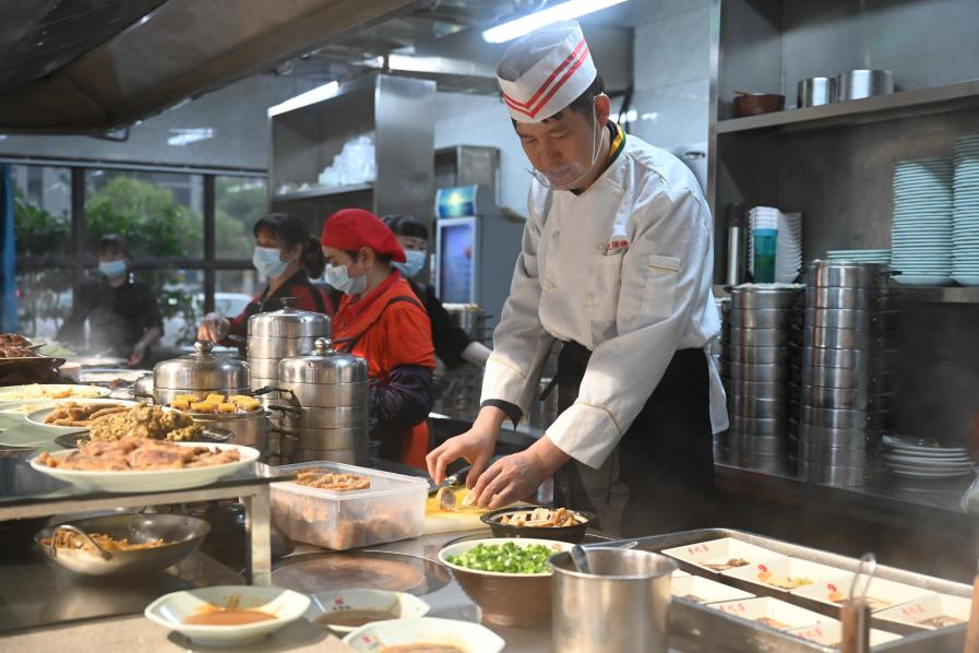 2023年4月14日,福建省三明市沙县区,沙县小吃技艺传承人李贤椿在制作沙县小吃“金包银”。新华社记者 林善传 摄