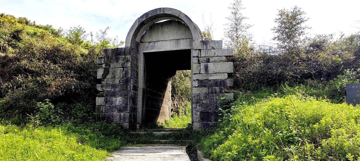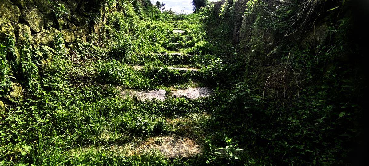 我们是由罗田县松子关村修建的水泥路开车到达关内的,在昔年的营房遗址处泊好车子。举目四望,遗址呈“凹”字型,东、西两面有高点,中间是平坦处。据罗田县文物部门考证,两边的高点当年建有了望亭,西面的高点处还有石城墙残存,中间的平坦处是营房和据守关口的军士操练场、场北面用石头铺成的古驿道还存有30米左右,石头被人们踏得光溜溜的,一直通往斜坡处的松子关大门。