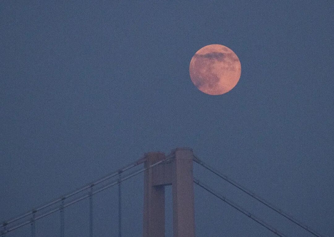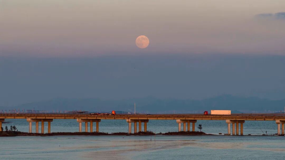 2025年11月5日,山东青岛市西海岸新区红石崖街道,“超级月亮”辉映洋河河海大桥。