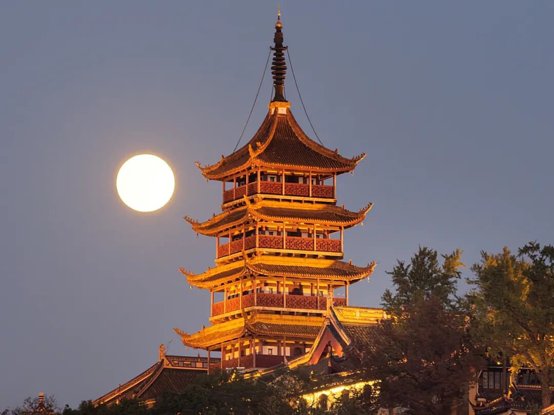 2025年11月5日晚,在江苏南通市崇川区拍摄的“超级月亮”和狼山国家森林公园支云塔、霓虹灯。