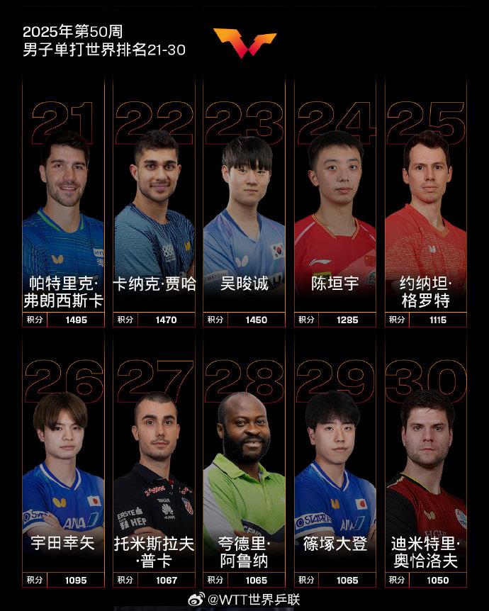 其他中国队球员,向鹏排名第11,陈垣宇排名第24,周启豪排名第41,陈俊菘排名第45,黄友政排名第49。