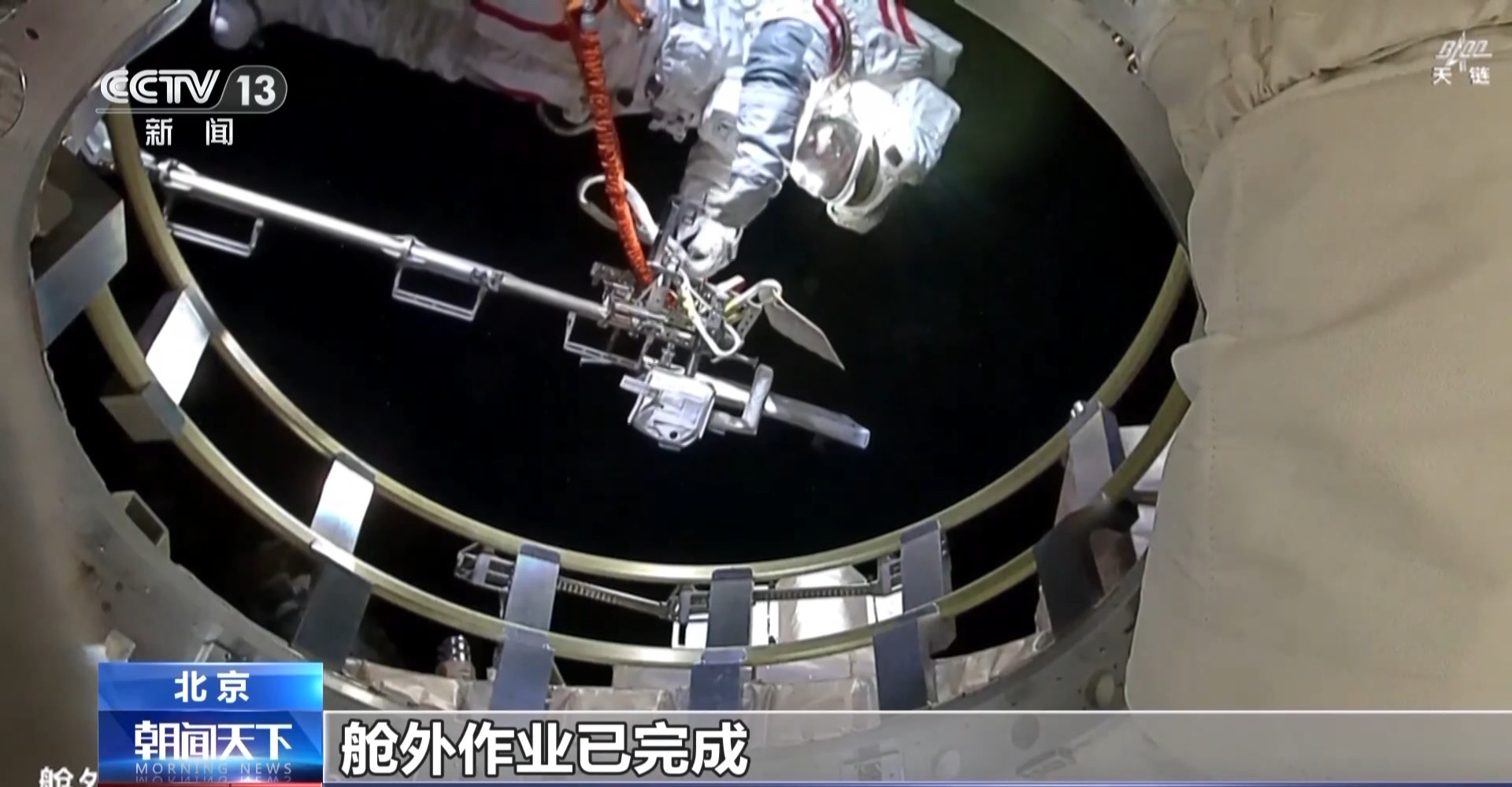 中国航天员科研训练中心 翟志宏:后续,我们重点对天和核心舱、梦天舱等其他两个舱的防护进行进一步出舱作业,按照预定任务,每次去装不同舱段防护板。目前工作进程都是按照预定计划进行的。