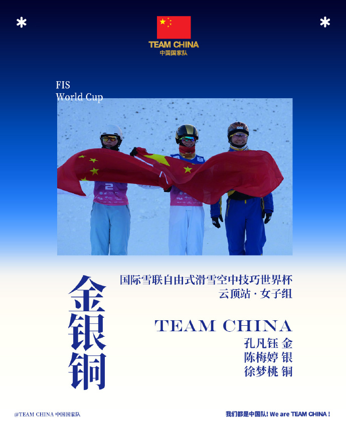 同日,在女子组决赛中,中国选手孔凡钰凭借两跳的稳定发挥,以102.17分夺得金牌,陈梅婷以97.45分摘得银牌,老将徐梦桃获得铜牌。