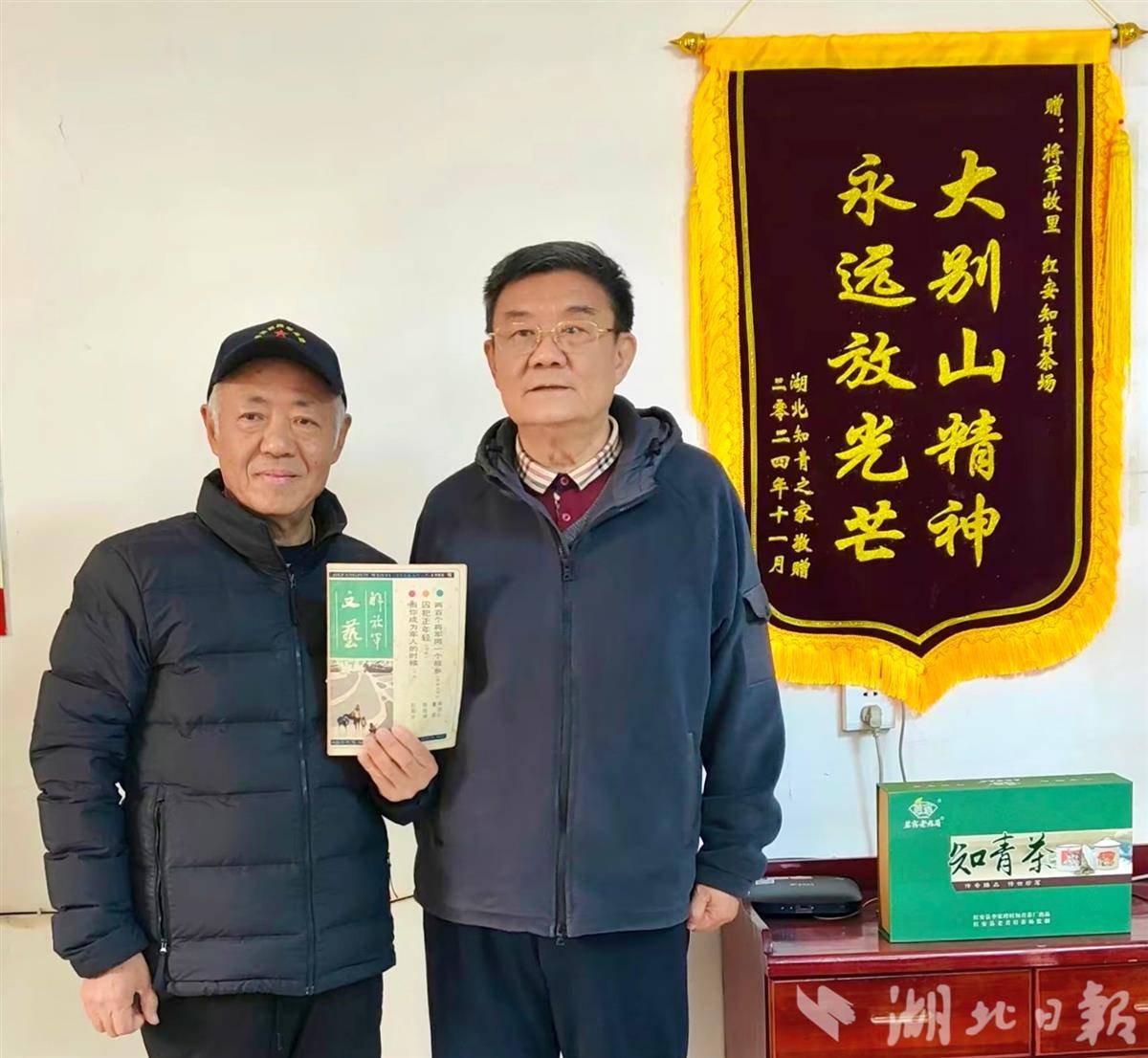 三天后的12月2日,董滨又应邀来到永佳河镇知青茶场。笔者和红色文化爱好者向东、龙源等有幸陪同。头天我特地从书柜里找出1985年4月21日购买的、早已发黄的《解放军文艺》,想请董老师签名。在茶场会议室,当董老师和夫人杨敏看到这本杂志时,很是惊叹地说保管得这么好,比我们家保存的那一本还要好。董老师为我题写了“红安永远红”的留言后,还在杂志上题写了“岁月如梭 四十年后再回红安 晓冬先生 董滨二〇二五年冬”。