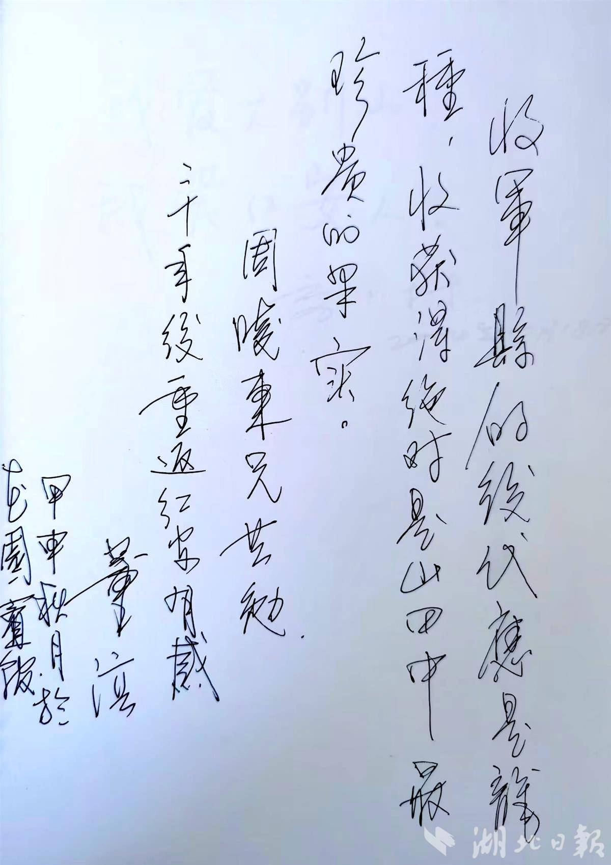 离开红安的时候,我们应邀到辛部长家做客,共同回顾了过去一个多月来的采访生活,都认为红安之行是人生难得的经历。我们对辛部长说:“一定要用手中的笔,为红安呐喊,为红安人民呐喊。”这次,董滨为我题写了“将军县的后代应是龙种,收获的绝对是山田中最珍贵的果实。周晓冬兄共勉 二十年后重返红安有感 董滨 甲申秋月于花园宾馆”的留言。