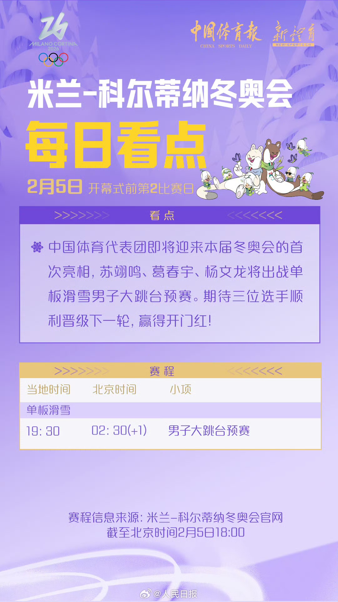 北京时间2月6日凌晨,中国体育代表团米兰冬奥会首秀将上演。苏翊鸣、葛春宇、杨文龙三位单板滑雪选手将一同出战男子大跳台预赛,期待他们顺利晋级,赢得开门红!