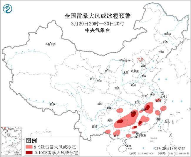 预计3月29日20时至30日20时,江南、华南等地的部分地区将有8级以上雷暴大风或冰雹天气,其中,湖南西南部和东部、江西西南部和东北部、贵州东南部、广西东北部、广东西北部等地的部分地区将有10级以上雷暴大风,最大风力可达11级以上,局地不排除出现龙卷的可能性;西南地区东部、江南、华南等地的部分地区将有小时雨量大于20毫米的短时强降水天气,其中,江西北部和西南部、广东北部等地的部分地区小时雨量大于50毫米,最大可达80毫米以上。